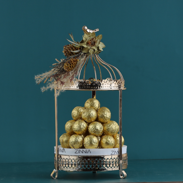 شوكولاتة بلجيكية فاخرة منسقة داخل قفص ذهبي ومزينة بالزهور المجففة.