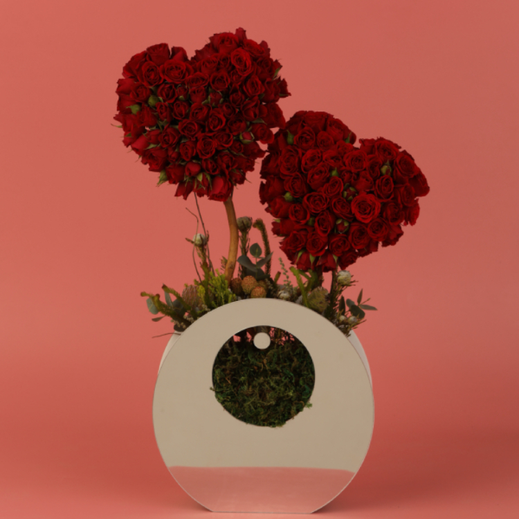 قلبين من زهور البيبي جوري في وعاء من الاكريلك مع مرآة.