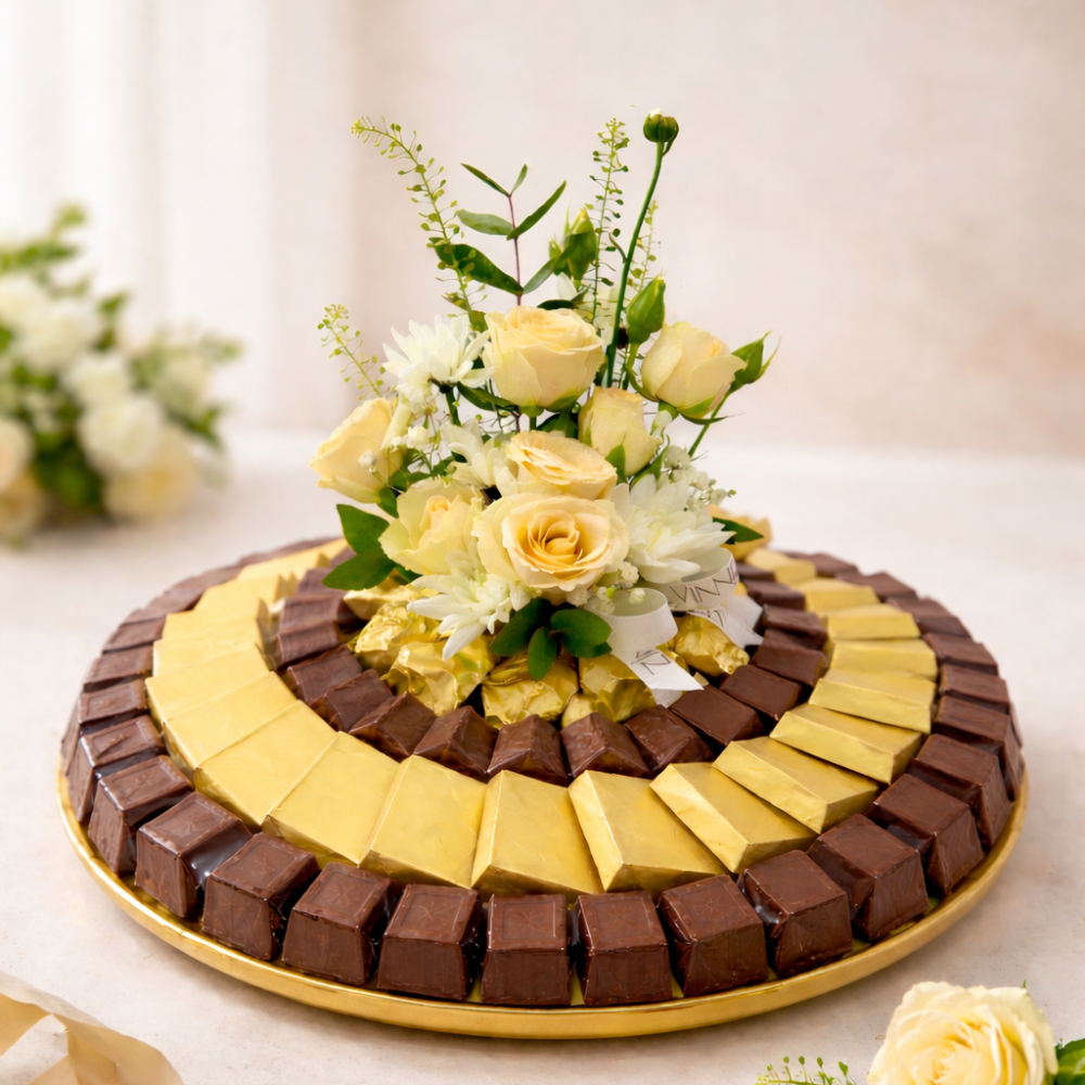 A delightful blend of fresh, blooming flowers with 86 pieces of fine Belgian chocolate, perfect for celebrating special occasions.