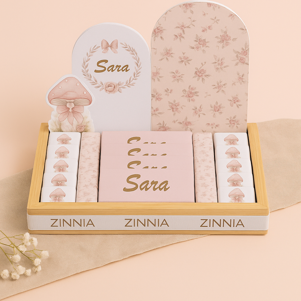 A wooden tray arranged with Belgian chocolates to welcome the new baby.