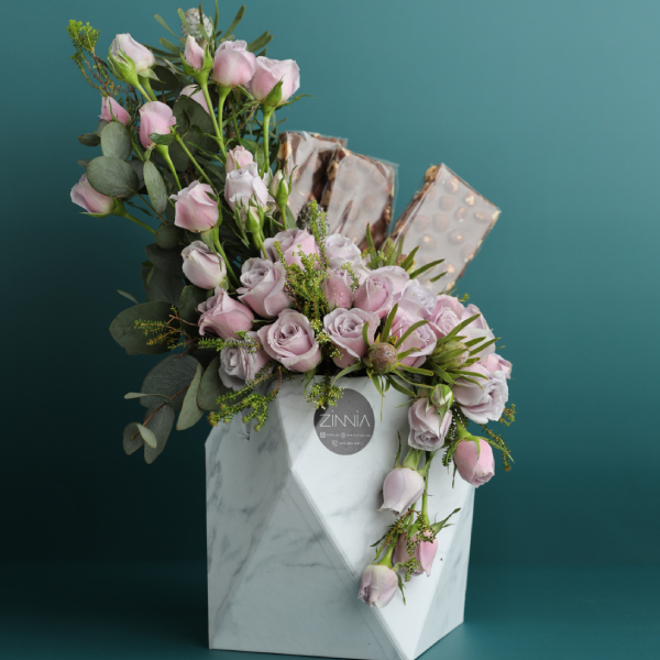 A beautiful arrangement of baby roses with delicious chocolate pieces stuffed with hazelnuts.
